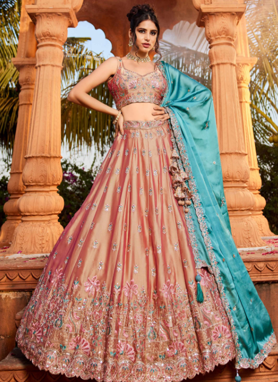 The dulhan lehenga is one of the most important garments for a bride since it shows who she is and what she wants on the most important day of her life. A dulhan lehenga is made with a lot of embroidery, bright colours, and fine details to make the bride stand out as the centre of attention. Brides typically take months to choose the right lehenga that goes with their style, skin tone, and wedding theme. The dulhan lehenga comes in a wide range of styles, from classic reds to soft pastels. It makes the bride look regal and royal.